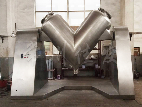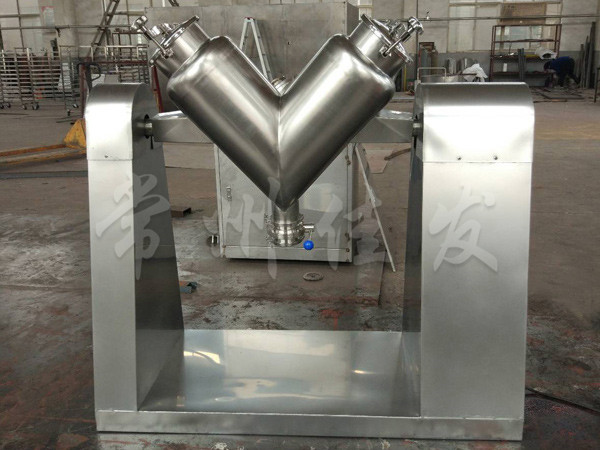 該機(jī)通過(guò)機(jī)械傳動(dòng),使不對(duì)稱的V型圓柱體內(nèi)的物料做往復(fù)翻動(dòng),達(dá)到均勻混合之目的。
